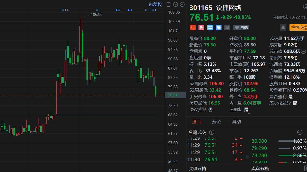 锐捷网络(301165.SZ)午间大幅收跌10.8%,月内累计跌幅近15%,现报76.5元,市值608.6亿元。消息上,锐捷网络昨日盘后公告杭州股票配资网,第三季度营收为40.31亿元,同比增长20.93%;净利润为2.28亿元,同比下降11.49%。前三季度营收为106.8亿元,同比增长27.50%;净利润为6.8亿元,同比增长65.26%。值得注意的是,前三季度公司成本端营业成本70.40亿元杭州股票配资网,同比增长29.82%,费用等成本30.19亿元,同比增长8.08%。